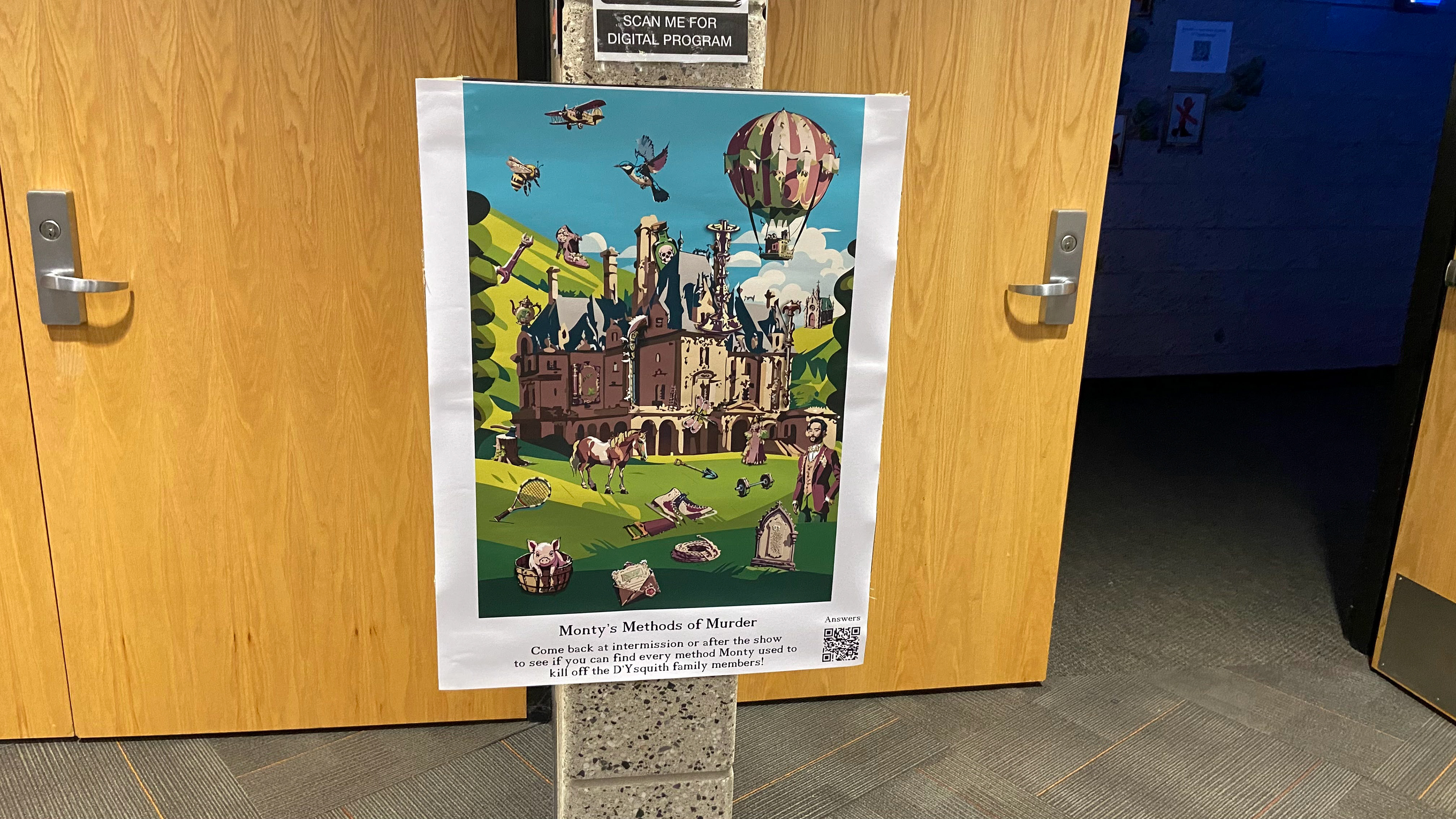 Another game set up to help the audience interact with Highhurst was the look -and-find with all the different weapons Monty used to kill off the D'Ysquith family. Audience members were able to look during intermission. Some even took pictures and looked for all the different weapons.